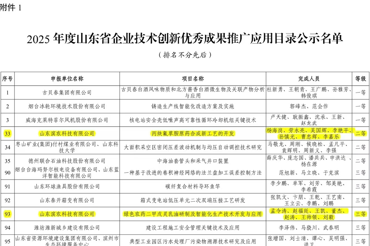 我公司兩項(xiàng)成果斬獲2025年度山東省企業(yè)技術(shù)創(chuàng)新優(yōu)秀成果獎(jiǎng)發(fā)布時(shí)間:2025-10-14 10:52 9月12日,山東省企業(yè)技術(shù)創(chuàng)新促進(jìn)會(huì)正式公布了2025 年度山東省企業(yè)技術(shù)創(chuàng)新優(yōu)秀成果推廣應(yīng)用目錄,我公司憑借在綠色農(nóng)藥研發(fā)與工藝創(chuàng)新領(lǐng)域的突破成果斬獲兩項(xiàng)省級(jí)榮譽(yù)——“丙炔氟草胺原藥合成新工藝的開發(fā)”獲評(píng)二等獎(jiǎng),“綠色農(nóng)藥二甲戊靈乳油研制及智能化生產(chǎn)技術(shù)開發(fā)與應(yīng)用”榮獲三等獎(jiǎng),彰顯了我公司在技術(shù)創(chuàng)新領(lǐng)域的強(qiáng)勁實(shí)力與行業(yè)競爭力。 ![]() |