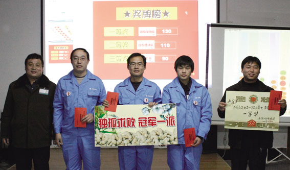 最后,經(jīng)過激烈火爆的比拼,五分廠獨孤求敗隊以130分摘得冠軍,科室二組封殺劈凈隊、二分廠飛翼隊分獲二等獎、三等獎。首屆企業(yè)文化擂臺賽在一片歡騰中圓滿結(jié)束,但是各選手仍意猶未盡,期待在下次擂臺賽上再顯身手。