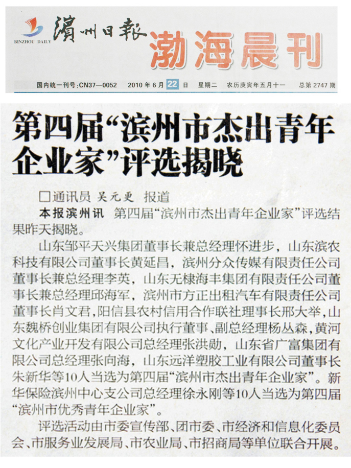 第四屆“濱州市杰出青年企業(yè)家”評(píng)選結(jié)果已于6月22日揭曉,我公司董事長(zhǎng)黃延昌等10位優(yōu)秀企業(yè)家當(dāng)選為第四屆“濱州市杰出青年企業(yè)家”。評(píng)選活動(dòng)由市委宣傳部、團(tuán)市委、市經(jīng)濟(jì)和信息化委員會(huì)、市服務(wù)業(yè)發(fā)展局、市農(nóng)業(yè)局、市招商局等單位聯(lián)合開展。
