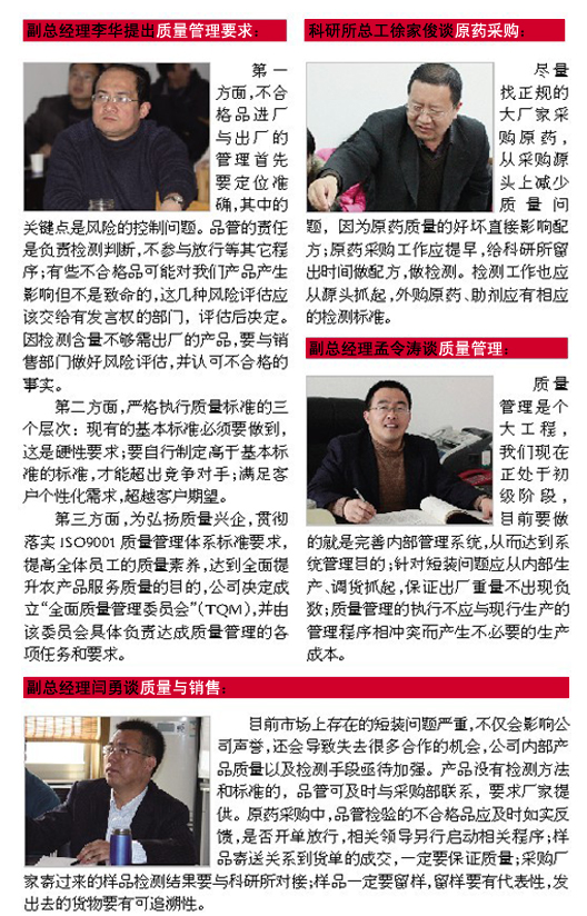 時(shí)間:2012-08-10 14:56在本月質(zhì)量管理月度例會(huì)上,公司部分高層管理者針對(duì)自己負(fù)責(zé)板塊存在的質(zhì)量隱患和改進(jìn)措施提出意見(jiàn)和建議: