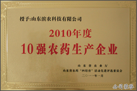 2011年1月21日,山東省農(nóng)藥檢定所召開了2011年山東省農(nóng)藥管理工作會(huì)議,會(huì)上山東濱農(nóng)科技有限公司被評為2010年山東省農(nóng)藥“四培育”活動(dòng)10強(qiáng)農(nóng)藥生產(chǎn)企業(yè)第一名。會(huì)議由省藥檢所所長楊理健主持,部所和省農(nóng)業(yè)廳領(lǐng)導(dǎo)就農(nóng)藥管理工作分別講話,并為獲獎(jiǎng)單位頒發(fā)獎(jiǎng)牌。山東濱農(nóng)科技有限公司市場總監(jiān)楊希坤代表獲得10強(qiáng)生產(chǎn)企業(yè)作了典型發(fā)言。