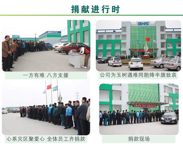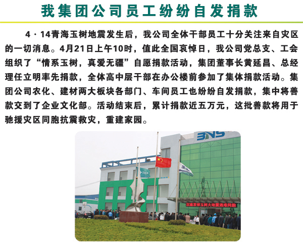 4·14青海玉樹(shù)地震發(fā)生后,我公司全體干部員工十分關(guān)注來(lái)自災(zāi)區(qū)的一切消息。2010年4月21日上午10時(shí),值此全國(guó)哀悼日,我公司黨總支、工會(huì)組織了“情系玉樹(shù),真愛(ài)無(wú)疆”自愿捐款活動(dòng),集團(tuán)董事長(zhǎng)黃延昌、總經(jīng)理任立明率先捐款,全體高中層干部在辦公樓前參加了集體捐款活動(dòng)。集團(tuán)公司農(nóng)化、建材兩大板塊各部門(mén)、車(chē)間員工也紛紛自發(fā)捐款,集中將善款交到了企業(yè)文化部;顒(dòng)結(jié)束后,累計(jì)捐款近五萬(wàn)元,這批善款將用于馳援災(zāi)區(qū)同胞抗震救災(zāi),重建家園。